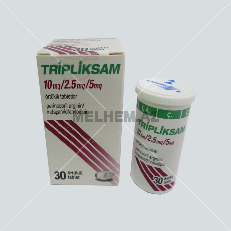Təsiredici maddə: bir ədəd örtüklü 10\2.5\5 Tripliksam tabletin tərkibində 6.790 mq perindopril, 2.5 mq indapamid və 6.935 mq amlodipin bezilat vardır.